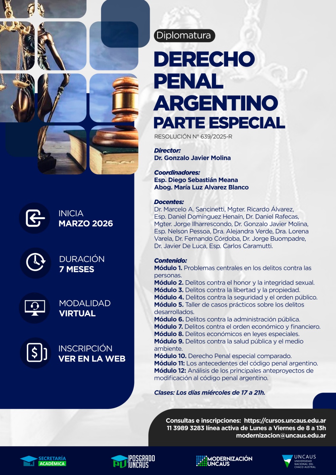Las clases comenzarían en marzo 2026 y hasta septiembre 2026. Todas las clases se dictan los días Miércoles de 17 a 21 h. Previamente durante la semana tendrán disponibles para visualización, videos de 1 hora referidos al tema a desarrollar en cada clase.