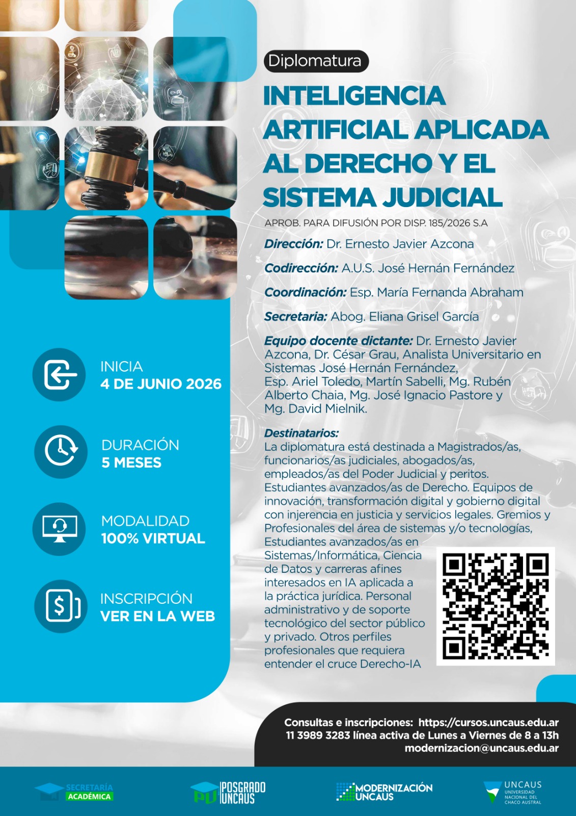 La diplomatura está destinada a Magistrados/as, funcionarios/as judiciales, abogados/as, empleados/as del Poder Judicial y peritos. Estudiantes avanzados/as de Derecho. Equipos de innovación, transformación digital y gobierno digital con injerencia en justicia y servicios legales. Gremios y Profesionales del área de sistemas y/o tecnologías, Estudiantes avanzados/as en Sistemas/Informática, Ciencia de Datos y carreras afines interesados en IA aplicada a la práctica jurídica. Personal administrativo y de soporte tecnológico del sector público y privado. Otros perfiles profesionales que requiera entender el cruce Derecho-IA