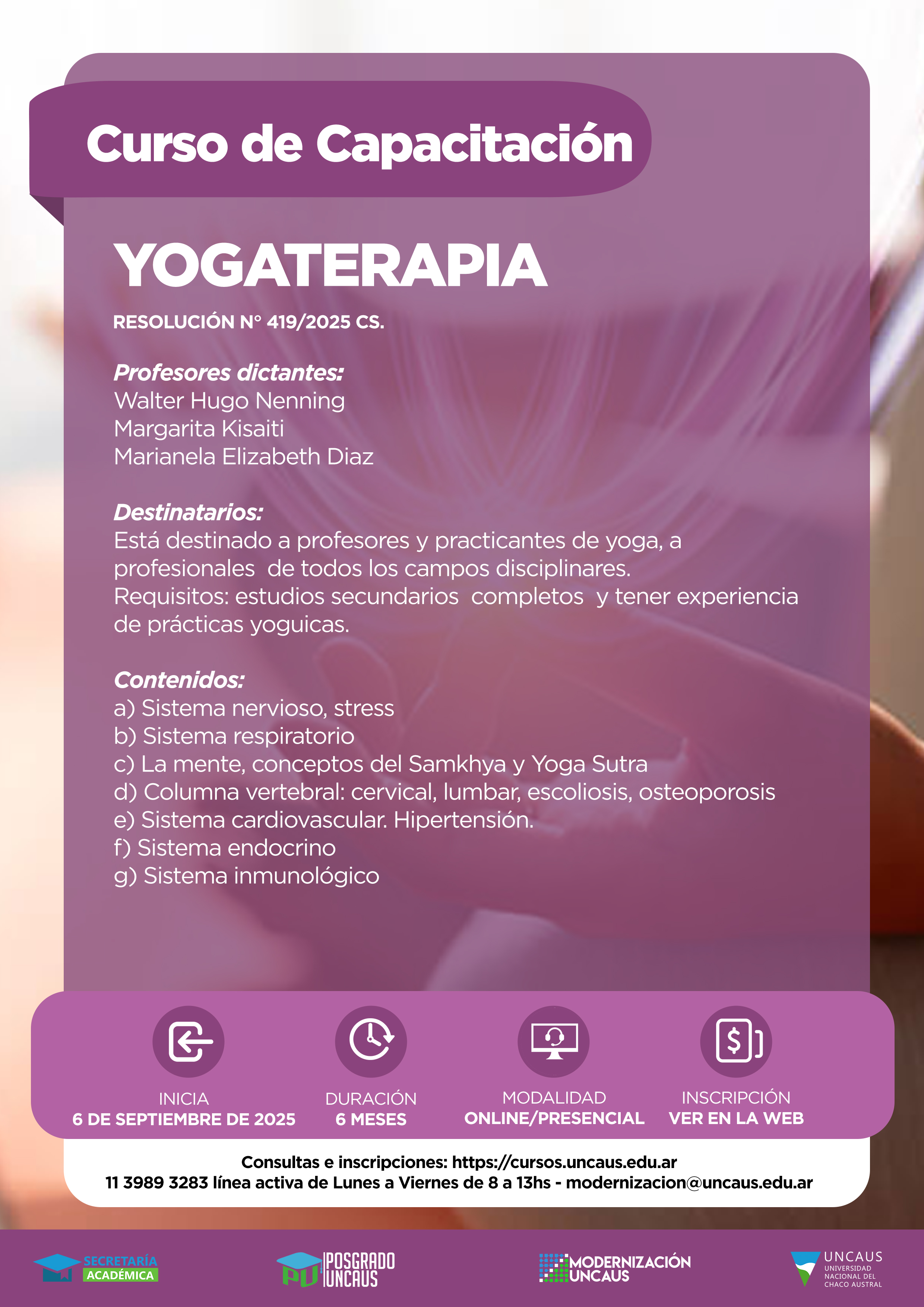 - Marianela Elizabeth Diaz: Instructora de Yoga, formación en Escuela Atmaboddha (Bs. As.) Escuela Te Lonavla Institute (India). Profesora de Yoga, Alianza Argentina de - Profesores de Yoga, Asociación Civil Cultura Yoga, Corrientes 2022. Instructora de Yoga, Alianza Argentina Profesores de Yoga, Asociacién Civil Cultura Yoga, Corrientes 2022. Participación de Encuentros sobre Textos Tradicionales de Yoga, Satsang con el Dr. M. Gharote de Lonavla Institute (India), años 2023, 2024; 2025. Retiro Intensivo Internacional dirigido por el Dr. M. Gharote, 2023. Yoga Íefapéutico, Escuela Vasanti Veda Yoga, graduada 2023. Sangfgísta Profesional, C,LB.E, España y EE.UU, 2024.