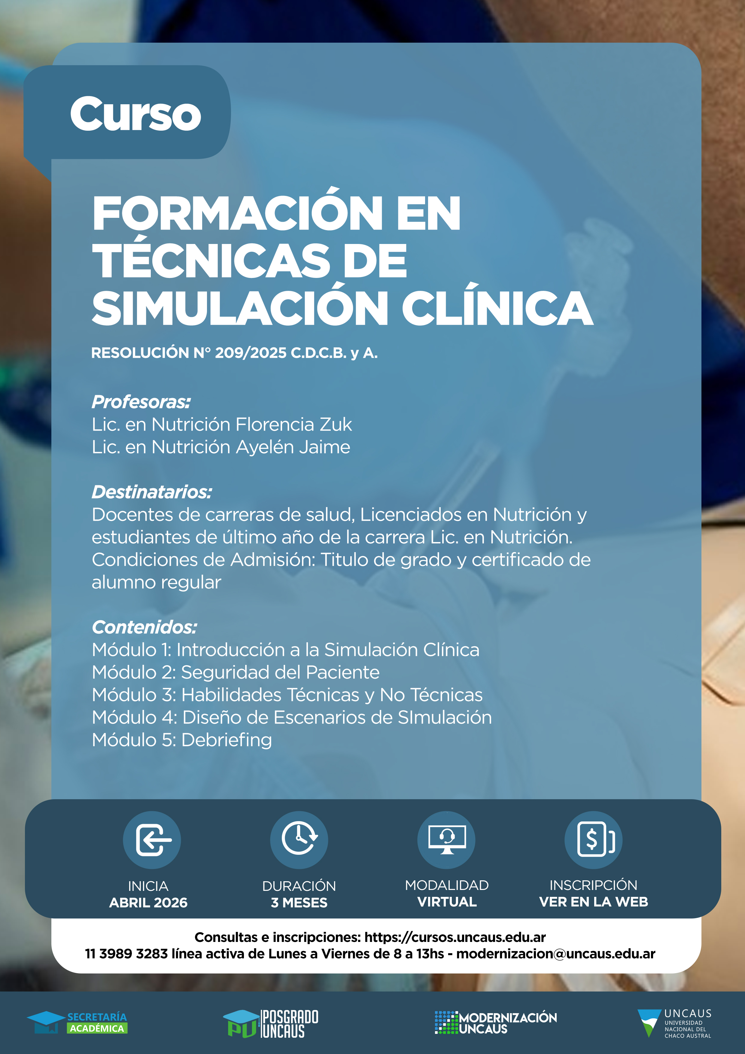 Profesor: Lic. en Nutrición Florencia Zuk: docente universitaria e investigadora en el desarrollo de bebidas funcionales a base de frutas y hortalizas del NEA. Es becaria de investigación de posgrado en el Instituto INIPTA (UNCAUS-CONICET), y ha participado en proyectos vinculados a nutrición materno-infantil y aprovechamiento de recursos locales para mejorar la alimentación complementaria. Ha publicado en revistas científicas, participado como evaluadora de tesinas y tiene formación en simulación clínica, alimentos funcionales y escritura académica.
